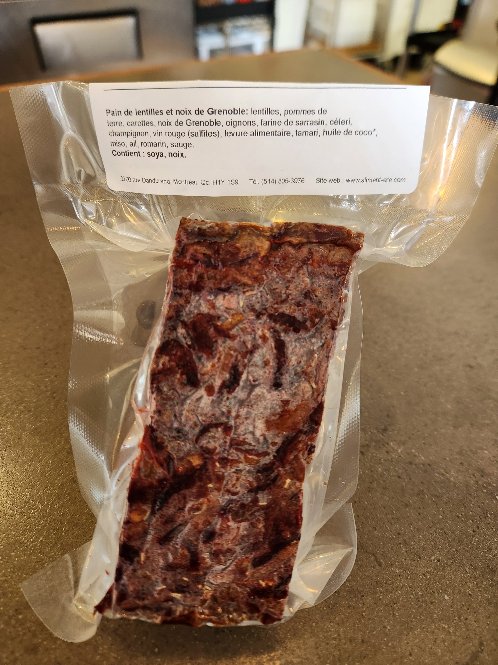 Ingrédients : lentilles, pommes de terre, betterave, noix de Grenoble, oignons, farine de sarrasin*, céleri, champignon, vin rouge (sulfites), levure alimentaire, tamari, huile de coco*, miso*, ail, romarin, sauge. Contient : soya, noix.
