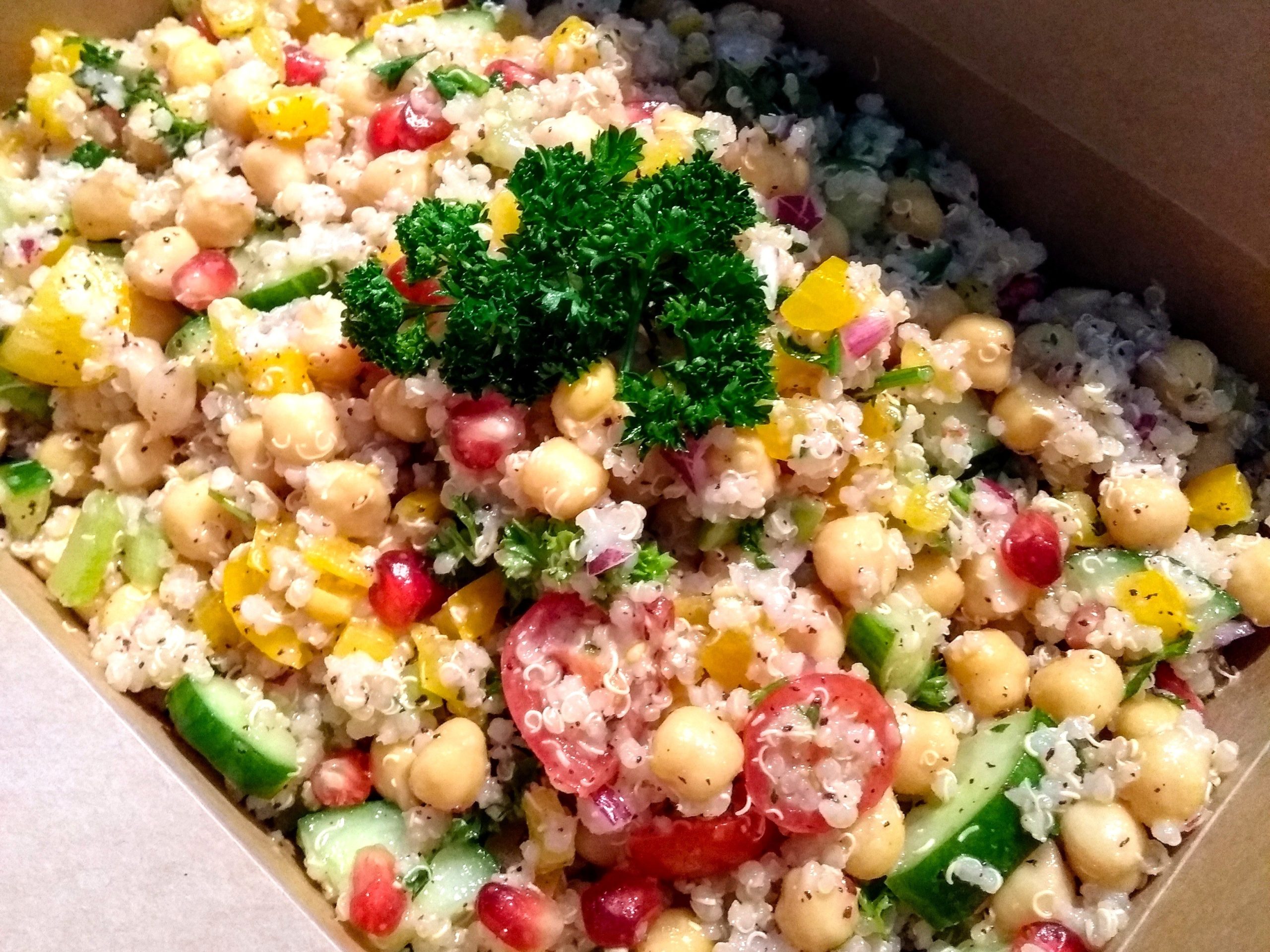 Salade méditerranéenne au sumac : pois chiches, quinoa*, poivrons, concombres, tomates, céleri, grenade, persil, oignons rouges. Vinaigrette : huile végétal, jus de citron, sirop d’érable, ail, sumac, sel, poivre.