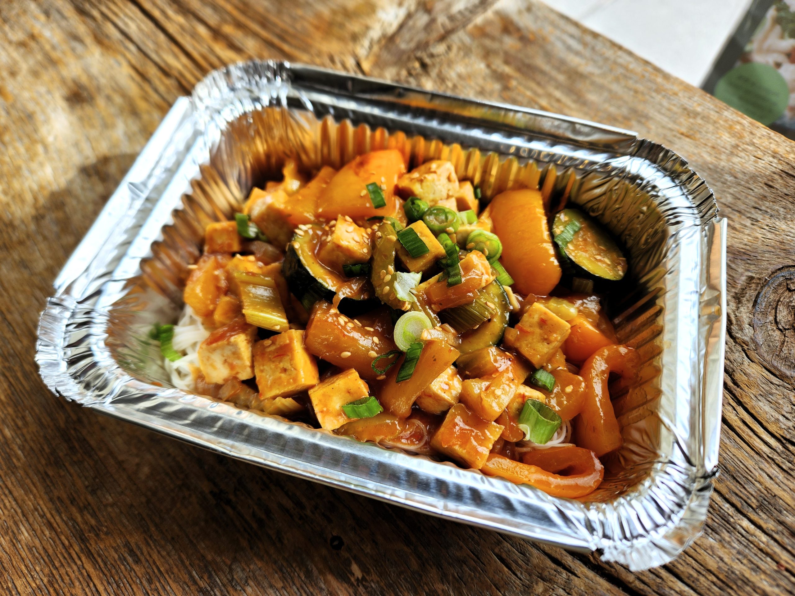 Découvrez notre tofu à l’ananas, une harmonie parfaite de saveurs accompagné de nouille de riz brun. Ce plat associe l’ananas sucré, des légumes croquants et une sauce aux abricots savoureuse, enrichie d’un soupçon d’huile de sésame, d’ail et de gingembre. Une expérience culinaire végétalienne à la fois exotique et satisfaisante.